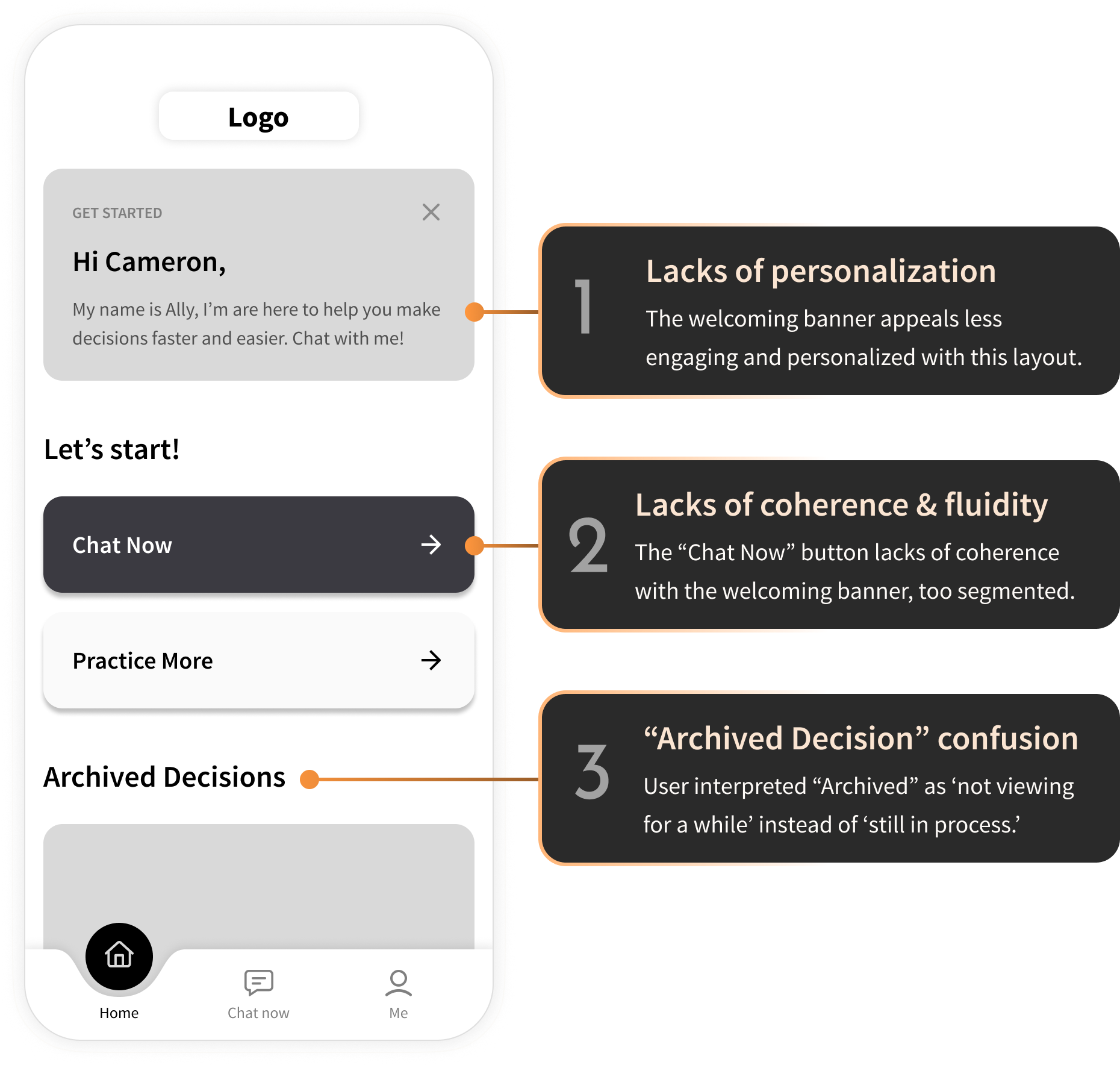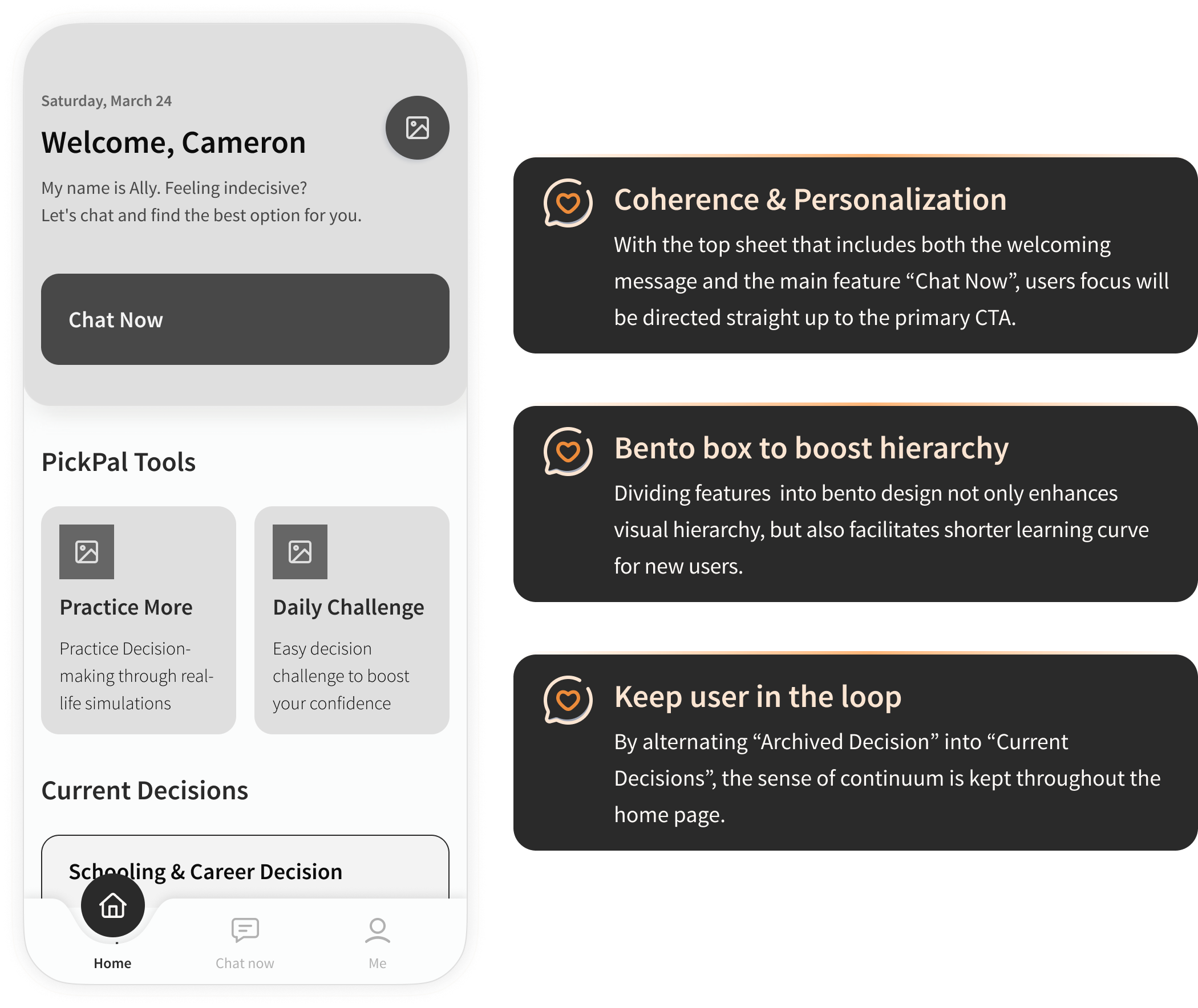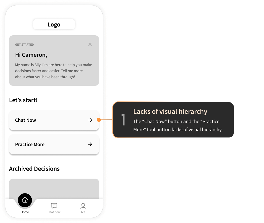 V1 5 usability tests were conducted, and the major feedbacks were taken into consideration to craft the 2nd version. V2 5 more usability tests were conducted based on the second version of the decision. Final Version Description goes here